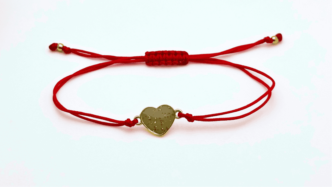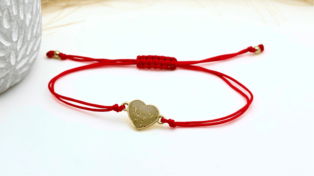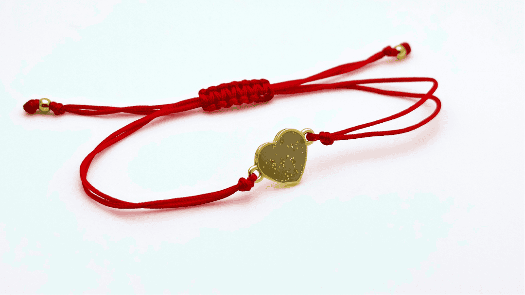 Wymiary bransoletki to 11 x 11 mm, obwód regulowany splotem makramowym, bransoletka wykonana na czerwonym sznureczku.