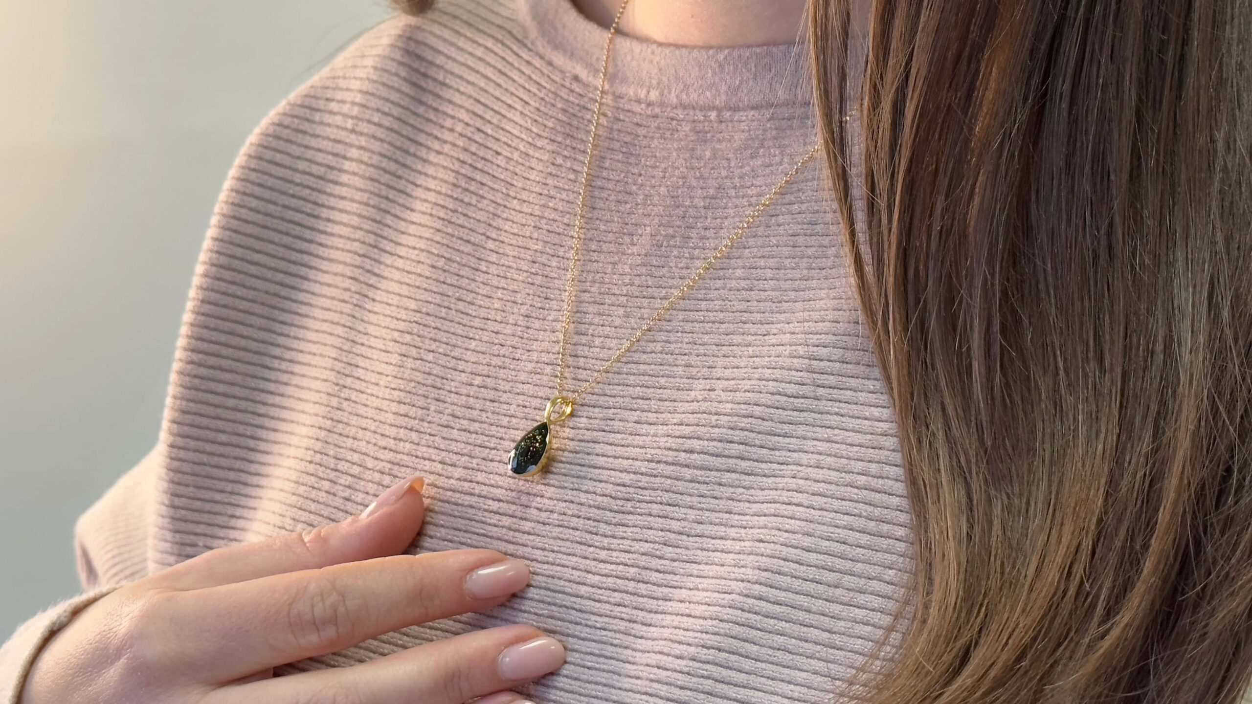 Zawieszka w kształcie łezki wykonana ze srebra próby 925 (pozłacane) z wbudowanym mikrochipem NFC, na którym umieścimy Twój filmik.